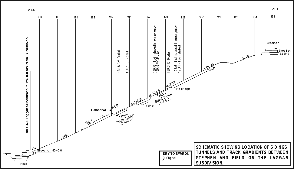 The portion of the subdivision from Stephen to Field, known as Field Hill, is single main track, with two designated sidings. The average descending grade is 2.2 per centFootnote 5 in the westward direction. There are sharp curves and several tunnels, including two spiral tunnels (see Appendix A).