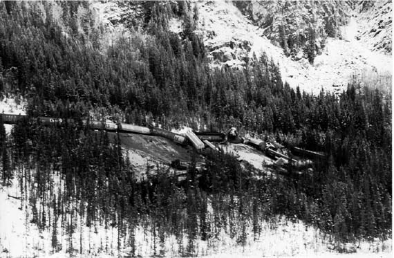 The 16 derailed cars at the first derailment site completely blocked the Upper Spiral Tunnel. At the second derailment site (Figure 2), cars were scattered down the steep embankment that sloped towards the Kicking Horse River.