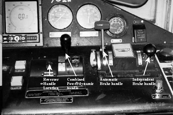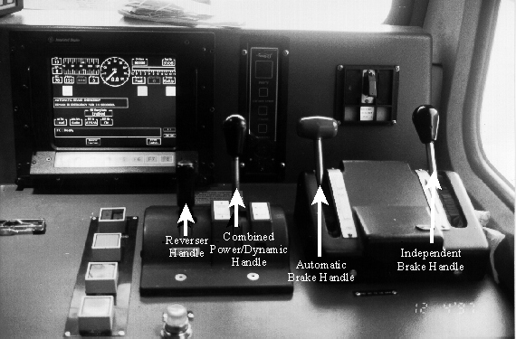 CPR's SD40-2 and SD40-2F (9000 series) locomotive fleet was equipped with locomotive engineer control stands of three different configurations. The earlier SD40-2 models had a GM Electro-Motive Division (EMD) control stand that used a single throttle lever, or combined controller, to control power and dynamic brake. Later models used an Association of American Railroads (AAR) control stand that had separate control levers for power and dynamic brake operation. The SD40-2F (9000 series) has a control console (desk type) with a combined power/dynamic handle on a master controller similar to that on a GE AC 4400 locomotive (see Figures 3 and 4).