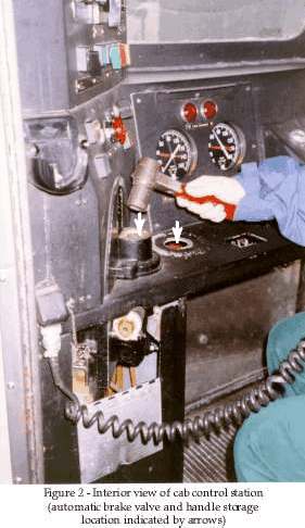 The cab control station is a small operating compartment located in one end of the cab car which is positioned at the tail end of the train. It is equipped with a console from where a crew member can control the train. An automatic brake valve is located within the cab control station. Local operating instructions require that the brake valve handle be removed and stored on the console when changing train control from the cab car to the locomotive (see Figure 2).