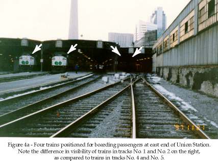 On tracks No. 1 and No. 2, the trains are positioned for boarding further to the west (see Figures 4a and 4b). The front of a locomotive positioned standing in track No. 1 or track No. 2 is recessed 160 feet in comparison with the east end of trains on the other tracks, 100 feet of which is inside the train shed. During daylight hours, trains in tracks No. 1 and No. 2 are not as easy to see as trains located in the other tracks, where the fronts of the GO Transit locomotives are plainly visible.