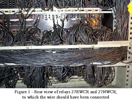 During the installation, the S&C installation coordinator had given instructions to the apprentice concerning the location of the wire, but he could not remember whether he had identified the relay by name or by its position on the rack. The apprentice had made the connection at the back of the rack and had connected the wire to terminal 12F on relay 27NWCR, the one right next to 27RWCR, to which it should have been connected (see Figures 2 and 3).