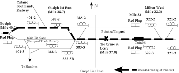 A track maintenance work program involving the replacement of track ties was in progress. At the time of collision, the main body of the tie gang was working on the south main track, between Signal 402 at Mile 40.2, the west end of Guelph Junction, and Signal 388-3 at Mile 38.85, Guelph Junction East (Figure 1). A smaller group was working under the direction of a sub-foreman on the south main track at Campbellville, approximately one mile east of the main gang, unloading ties from a lorry with a tie crane.
