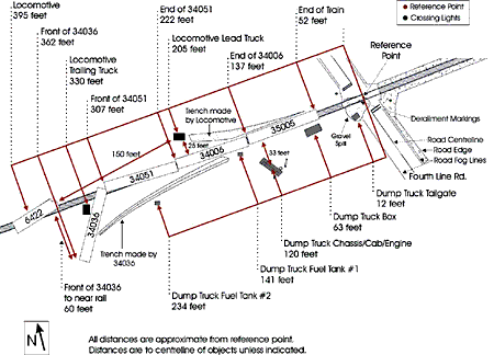 Upon impact, the locomotive and four passenger coaches derailed to the north of the main track and west of Fourth Line Road. The derailed locomotive became disengaged from its trucks, rolled onto its side and rotated 180 degrees, eventually stopping 395 feet west of the crossing parallel to the main track. The dump truck was thrown westward 120 feet and catapulted southward approximately 33 feet. Fuel oil was spilled from both the locomotive and the dump truck fuel tanks, but did not ignite.