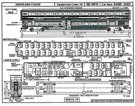 There were two types of passenger coach on VIA 85: three superliner bi-level passenger coaches, AMT 34000 series (see Appendix B), and one superliner bi-level coach / snack bar car, AMT 35000 series (see Appendix C). Plan and profile drawings of these series are found in appendices B and C respectively. The AMT 34000 series coaches seat 74 passengers - 62 in the upper level and 12 in the lower level. The last two cars, coach and snack bar combination cars, were identical to the two leading coaches in every aspect in the upper level. However, in the lower level, the seating area was equipped with a food-serving area and limited seating consisting of four double seats.