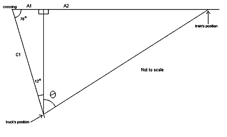 The following data and calculations were used to determine truck and train distances before the collision, and the position of the train in the truck driver's visual field as he accelerated toward the crossing. The truck entered the roadway from a standing stop (i.e., Vi = 0) 360 feet from the crossing. The train approached the crossing at a constant velocity of 63 mph. The crossing angle was 78 degrees, as shown in the diagram below. Two simplifying assumptions are made: first, that truck acceleration was constant, and second, that train velocity was constant (although the train had actually slowed to 60 mph under emergency braking when the collision occurred). These assumptions affect the calculations by a few feet at most.