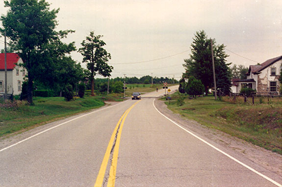 County Road 28 is a two-lane asphalt highway with a posted speed limit of 80 km/h. The crossing is equipped with flashing lights and a bell. The crossing angle is approximately perpendicular, with a descending road grade to the crossing of approximately 3 per cent from the east and 3.5 per cent from the west. When a driver approaches the crossing from the west, the roadway runs southward in a shallow curve for 310 m.