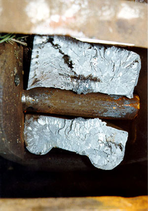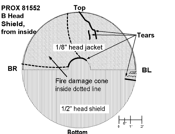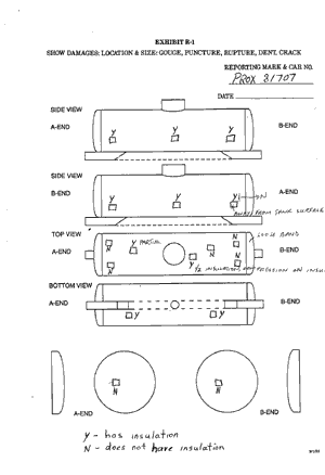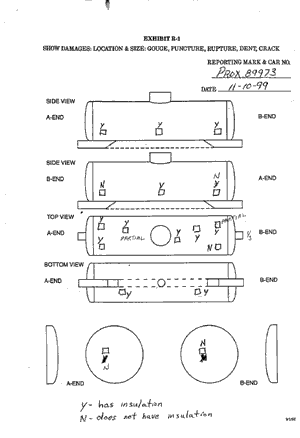The jacket of ammonia car PROX 81179 was badly scorched due to fire. Except for a residual amount (heel) of refrigerated product remaining in the car, the car lost most of its contents within eight hours of the derailment. The majority of the ammonia burned off rather than forming a gas cloud. Figures 4, 5 and 6 show some of the fire damage on the exterior of the tank and the frosting due to the refrigerated heel. Twelve hours after the derailment, there were about 10 inches of product left in the tank car as indicated by the frost line. In the bolster areas of the car, the frosting peaked at higher levels due to higher thermal conductivity in that zone.