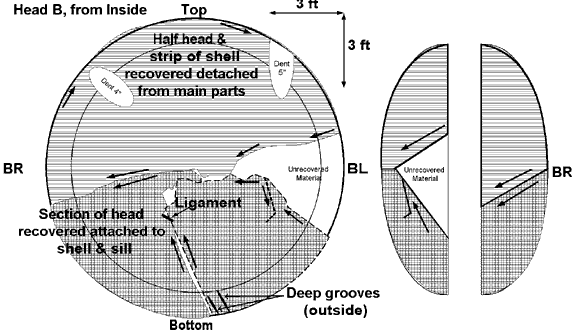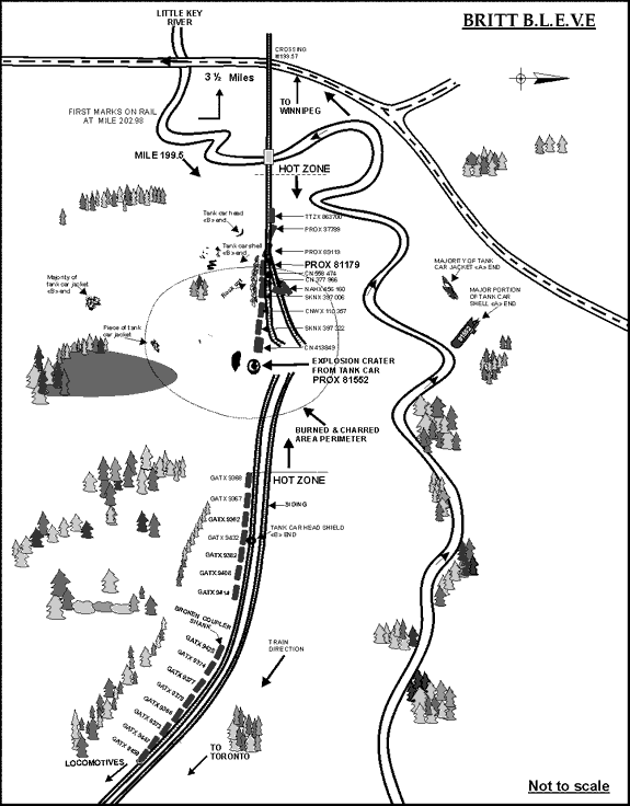 The conductor and a maintenance-of-way employee (who was with a work gang whose boarding cars were located in a back track off the siding at Mowat) travelled by truck on an adjacent access road to the rear of the train where they saw fire and smoke. Approximately one-half hour after the derailment, they heard a loud explosion and, at the same time, the RTC in Toronto experienced a loss of the Centralized Traffic Control System signal from Ardbeg, Ontario, north to Capreol, Ontario. An OPP officer on the scene recorded the time of the explosion as 1348. Another CN maintenance-of-way employee recalled hearing two explosions, at around 1320 and 1345. Detailed examination after the accident revealed that the tank car loaded with LPG (PROX 81552) had exploded. Pieces of the tank shell and jacket were projected in all directions. The larger pieces of tank car wreckage are identified on the derailment schematic in Figure 2.