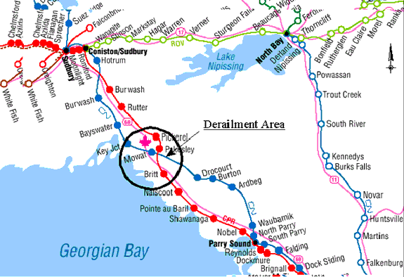 On 23 September 1999, Canadian National (CN) freight train M304-41-21 (the train) was proceeding southward towards Toronto, Ontario, at a speed of approximately 35 mph. The train was made up of 94 cars, 54 of which were tank cars of various products (41 of the 54 were carrying or last carried dangerous goods). At 1311 eastern daylight time (EDT),Footnote 1 at Mowat, near Britt, Ontario, the crew members experienced a train-initiated emergency brake application. Subsequent inspection of their train revealed that a major derailment had occurred. The crew radioed the rail traffic controller (RTC) in Toronto who initiated CN's emergency response (ER) including dispatch of the CN police. The first non-railway responders that arrived on the scene were the Ontario Provincial Police (OPP) who arrived at 1348, and the Britt Volunteer Fire Department who arrived at 1400. Other emergency responders included the liquefied petroleum gas (LPG) and anhydrous ammonia ER teams, and Ministry of the Environment (MOE) of Ontario, Emergency Medical Services, and Transport Canada (TC) officials.