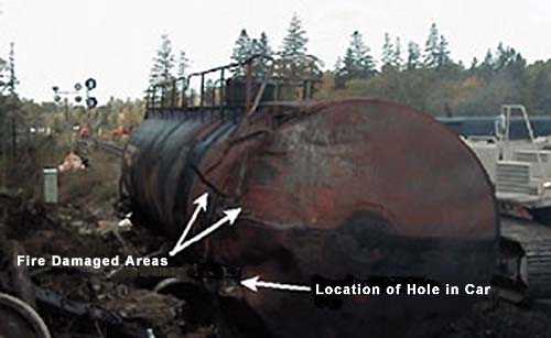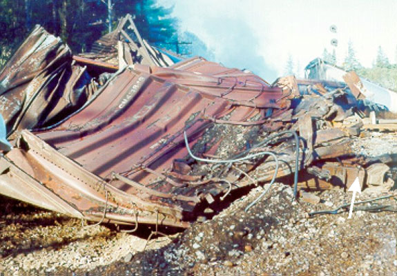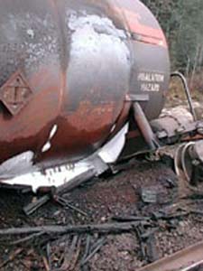 A crater in the right-of-way measuring approximately 2 m deep, 3 m wide and 15 m long was created by the LPG fire and subsequent violent rupture of the tank, which destroyed the roadbed and altered the physical state of the soils and other materials in the area. A box car immediately west of the LPG tank was crushed and bent 90 degrees. The main track and adjacent siding track were moved laterally and destroyed. Debris of demolished rail cars was strewn about the derailment. The adjacent trees and earth were scorched black for a radius of approximately 200 feet. Aerial photographs show the effect that the ensuing fireball and chemical release had on the vegetation surrounding the derailment location (see Figure 3).