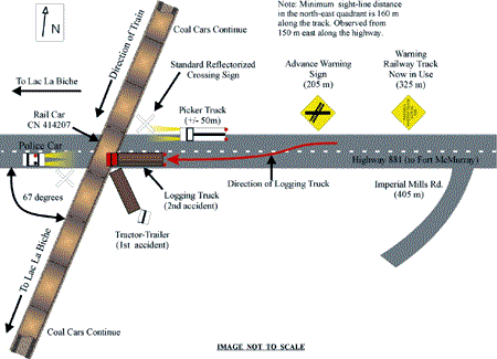 The westbound semi-trailer had been steered into the south-east ditch in an attempt to avert collision with the train. As a result, the truck spun 180 degrees and the rear of the empty trailer struck the train. The driver of the truck was not injured. Assistance was offered by a number of highway drivers who arrived on the scene. After the accident, approaching vehicles stopped on the east side of the crossing. The RCMP officer arrived at the scene from the west at approximately 2115, followed shortly by EMS and a fire department crew from Lac La Biche. The RCMP patrol car was stationed approximately 60 m west of the crossing in the eastbound lane, with the flashing beacon lights operating and the headlights on bright, facing the train. Upon determining that the highway was impassable, motorists began using Imperial Mills Road, located approximately 400 m east of the blocked crossing, which reconnected with Highway 881 approximately 2 km west of the crossing. Ambulance and fire crews were released from the site when it was determined that there were no injuries.