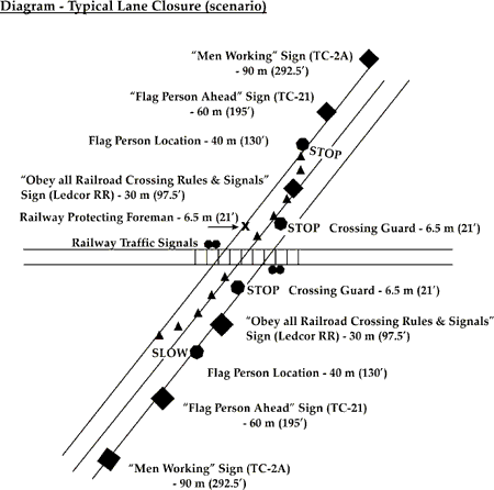 - Two additional traffic control flag persons ("Crossing Guards") supplied by 360 will be positioned a minimum of 21 feet (7 metres) from the track, on both sides of the crossing.