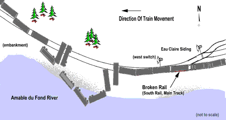 In the vicinity of the derailment, the track was adjacent to the Amable du Fond River and was oriented in an east-west direction. The derailment occurred in a 3-degree, 45-minute curve, near the west end switch of the Eau Claire siding (see Figure 2). The tie plates were secured with 8 spikes per tie in the turnout, and 10 spikes per tie in the rest of the curve. Several rail joints, within a short span, were present on the track east of the switch. The main track stock rail, on the west-end switch, was broken into many pieces over a distance of approximately 6 feet (183 cm). The break extended westward, from a bolt hole located 10 inches (25 cm) west of a rail joint, to the switch point heel block. The rail ends at the joint were battered and exhibited material flow.