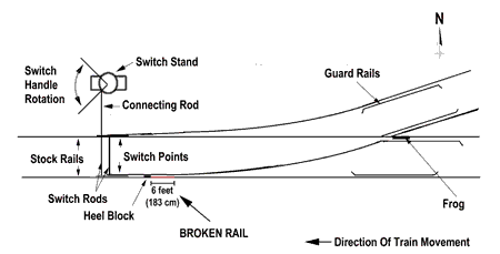 As subsequent wheels struck the broken rail head, the fracture propagated over a distance of 6 feet (183 cm) to the heel block of the switch, and led to the derailment of the train.