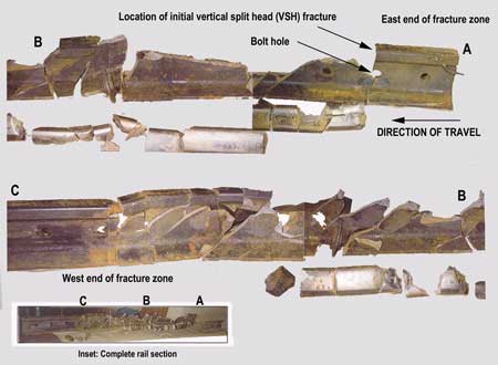 - The break occurred 10 inches (25 cm) from the rail joint, through a bolt hole (see Figure 3). The rail head had broken along the centre line consistent with a vertical split head (VSH) fracture.
