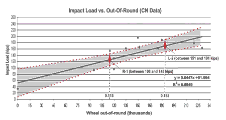 A 1994-1995 study established a correlation between WILD data and out-of-round wheel measurements. The impact loads generated by the wheels of car CPWX 601303 were interpolated using data from this study (see Figure 5). The interpolation shows that, when a 95 per cent confidence interval was used, the impact loads would have been between 108 and 145 kips (108 000 and 145 000 pounds) for wheel R-1 (out-of-round value 0.115), and between 151 and 191 kips (151 000 and 191 000 pounds) for wheel L-2 (out-of-round value 0.185).
