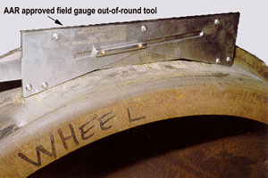 The purpose of safety inspections, performed by a certified car inspector, is to ensure that cars are deemed reasonably safe prior to allowing them to proceed down the track. During a safety inspection, each component of a car is examined and checked with measuring devices and gauges, when required. Defects such as shells or spalls can be identified visually; however, when they are healed (when metal flows into the spall cavities), they can only be identified by WILD systems. The detection of out-of-round wheels requires precise measurement at three locations using an out-of-round gauge (see Photo 1), or the use of WILD systems.