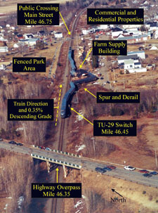The derailment occurred between a highway overpass located at Mile 46.35 and a public crossing (equipped with flashing light signals and bell) located at Mile 46.75 (Figure 6). Although the train movement was designated as westward, in this location the track infrastructure was oriented north/south. The track was tangent on a 0.35 per cent descending grade. At Mile 46.45, there was a switch for an industrial track (TU-29). The industrial track was equipped with a derail which protected the main track from unintentional movements of rolling stock. There was a fenced park area to the west side of the tracks, and a mix of commercial and residential properties to the east side of the main track. The last intermediate signal (identified as H443) before the TU-29 switch was located at Mile 44.3. At that location, there was also a wayside inspection system (WIS).