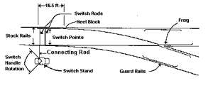 Track TU-29 was connected to the main track with a No. 10 turnout with a rated design speed of 15 mph. The distance from the tip of the switch point to the heel was 16.5 feet (Figure 7). It was noted that the tip ofthe switch point closest to the switch stand had some fresh markings and was slightly battered. It was also noted that the end of the switch point, by the heel block, had a slight bend. The guard rail on the main track opposite the frog was damaged by wheel impact and was bent towards the industrial spur track. There were marks noted on the base of the rail, on the ties, and in the ballast from the turnout location up to the first derailed cars. There was no track damage prior to the turnout location.