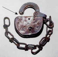 The switch stand was equipped with a standard CN switch lock (Figure 9). The clasp mechanism was broken and the switch lock was hanging loosely, suspended by the chain that affixes the lock to the switch stand. The lock had numerous dents and deformations (Figure 10).