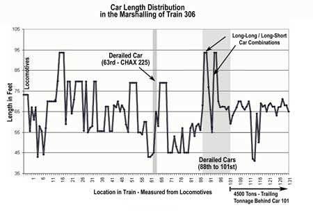 Most of the loaded cars on train 306 were located in the tail-end portion of the train (see Figure 2). There were several long-long and long-short car combinations in the consist (see Figure 3). Ten of the cars were equipped with EOCCDs. Train 306 passed by a wayside information system at Mile 200.5; no defects were noted.