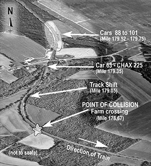 The 88th car to the 101st car derailed in the entry spiral of a right-hand curve between Mile 179.75 and Mile 179.52. The 88th car remained upright. The 89th car to the 92nd car were rolled over south of the track. The 93rd car and 94th car, two long automobile carriers with end-of-car cushioning devices (EOCCD), jack-knifed, and six loaded pressure tank cars containing liquefied petroleum gas piled-up behind them. The derailed tank cars sustained damage to their head shields and stub sills.