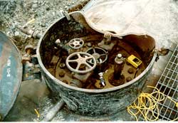 The 95th car, CITX 4240, a class 112 pressure tank car, came to rest on its side, striking the underframe of the 94th car. The protective housing was bent, damaging the liquid eduction valve (see Photo 3) and causing a release of butane.
