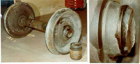 The lining used to protect the axle journal fillet area had lost some of its flexibility and had completely dried out; the lining used was an asphalt-based anti-oxidation coating approved by the Association of American Railroads (AAR), a lining currently used on axles. The bearing ring, the cones and the axle roller bearings showed signs of spalling on the fracture surface.