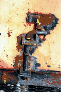 The door had been supported by three hinges. The hinge weld areas on the fallen door were shiny and rust free, indicating that they had been recently torn off. The door locking device consisted of two brackets welded to the door face with a pin that slides through the brackets into the car floor (see Figure 2)