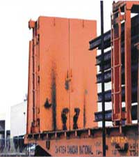 The rail transporter consist is marshalled with a bulkhead door car at each end (see Figure 1). The doors open towards the rail and ensures containment of the rail should it shift in transit. This type of equipment is restricted to a maximum speed of 40 mph.