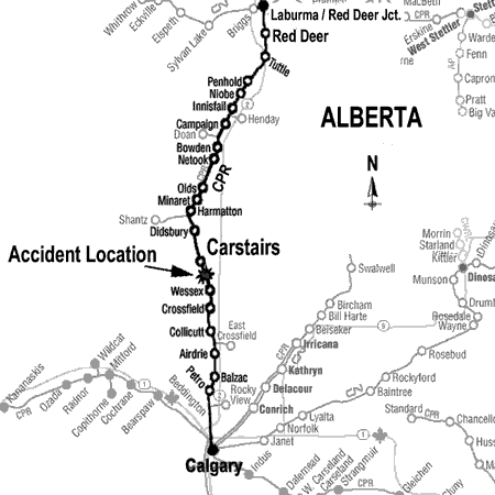 The temperature at Olds, Alberta, the closest weather station to Carstairs, at the time of the derailment was 29°C. The winds were from the south at 11 km/h and the sky was clear.