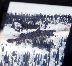 The derailed cars were lying accordion style and piled up on top of each other, forming a heap of scrap and iron ore on the right-of-way (see Photo 1). Thirty-three cars were destroyed and seven cars were seriously damaged. About 300 metres of track was damaged. The weather was clear and the temperature was -12°C.