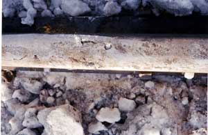 At approximately Mile 139.33, where the destruction of the track started, the rail had a crushed head (see Photo 3). This surface defect was noted in the inspection of 05 February 2002 and was categorized as "priority 1." A few feet south of this defect, the rail was broken under the last derailed car. Four pieces of broken rail, two pieces of rail head and two pieces of rail base were recovered and sent to the TSB Engineering Laboratory for analysis. There were no wheel flange marks or marks from dragging parts to the north of where the rail was broken. Wheel flange marks were visible east of the track, leading to the first derailed car.