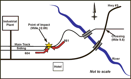 At approximately 0255, while proceeding westward at 20 miles per hour (mph), the crew of train 861 observed train 604 foul of the main track at the west end of the Natal siding and placed the train brakes in emergency. train 861 side collided with train 604 at Mile 12.89 at a speed of about 14 mph. After striking train 604 and pushing it back 53 feet, train 861 came to a stop in approximately 100 feet. The conductor suffered minor injuries as a result of the collision. There was no one on train 604 at the time (see Figure 1 for a schematic of the collision area).
