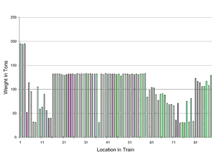 The train was mostly made up of loaded cars. The initial block of six cars behind the locomotives consisted of a loaded box car, a 93-foot flat car with a dimensional load, a loaded box car, two empty bulkhead centre-beam flat cars, and a loaded flat car, respectively. All except seven of the cars trailing the first block were loads; over 90 per cent of the train's weight (8455 tons) trailed the two empty centre-beam flat cars. The train service plan outlined that the first six cars would normally have been at the rear. The 93-foot flat car with a dimensional load prone to load shifting was marshalled, with the two box cars as appropriate buffer cars, close to the locomotive, in compliance with CN's dimensional load handling instructions. The two empty bulkhead centre-beam flat cars were within this block and subsequently moved to the head end of the train. Figure 1 below illustrates the tonnage (weight) distribution of the train.