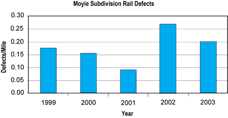 CP's rail flaw detection car had tested the Moyie Subdivision three times a year since 1999. For the years between 1999 and 2003, total annual rail defects identified were 25, 22, 13, 38 and 30, respectively. Defects per mile tripled between 2001 and 2002, with a slight decrease in 2003. The most recent ultrasonic test over this territory took place 35 days prior to the accident, on 19 September 2003; no defects were noted in the area of the derailment. In the area of the POD, the rail flaw detector car showed an intermittent response typical of a rail head surface condition. No further action was required of the rail test operator and none was taken. The chart below shows the five-year rail-defect history for the Moyie Subdivision.