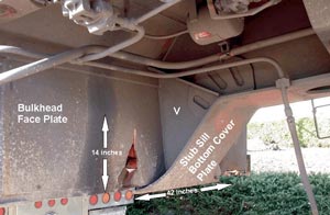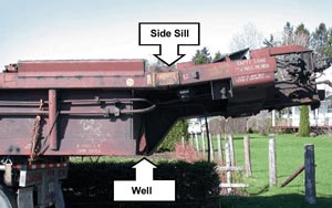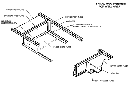 In the stub sill area of the well, the floor and end wall (or bulkhead) of the car meet at a right angle (see Figure 3). The bulkhead bottom angle is attached between the floor shear plate and bulkhead face plate. Corner post angles are connected to the bulkhead face plates and the left and right sidewalls. All components are connected to each other with fillet welds.