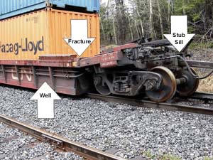 The accident occurred when car DTTX 72318, an articulated, five-pak, 125-ton double-stack car (note: CN 677048 was a 100-ton double-stack car), experienced a separation between the floor shear plate and bulkhead bottom angle. A lateral fracture was found at a weld between the floor shear plate and the bulkhead bottom angle, at the leading end of the B platform of the car. The fracture, for the most part, followed the toe of the weld on the floor shear plate side and penetrated completely through the floor shear plate.