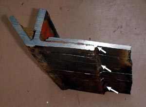 Photo 5 shows a cross-sectional view of the geometry of the parts involved in the area where the bottom steel angle attaches to the stub sill and floor. The specimen was taken from the opposite undamaged end of car CN 677048-E after a pre-existing crack was mechanically opened.