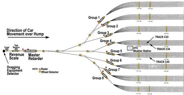 During the humping process, rail cars initially roll down an incline over a dragging equipment detector to check for dragging car components. Using rail-mounted wheel detectors, the axle count and the wheelbase of the rail car is determined. After the rail car is weighed, it is categorized by weight as follows:
