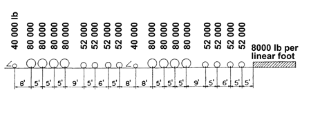 This Cooper E loading schematic shows the axle distribution as originally presented by Theodore E. Cooper in 1894 using the wheel spacing of a steam locomotive of that era. The weights per axle shown on this schematic are those specified by the actual AREMA (American Railway Engineering and Maintenance of Way Association) standards.