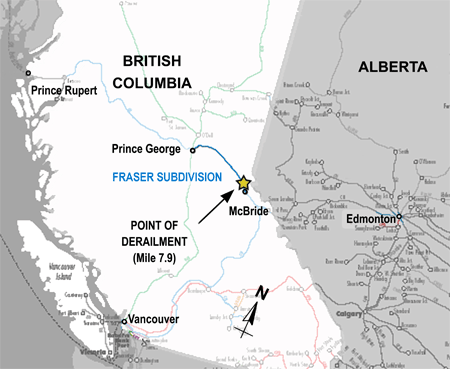 On 14 May 2003, at approximately 1210 Pacific daylight time, Canadian National freight train No. 356-51-14, travelling eastward from Prince George, British Columbia, to Edmonton, Alberta, derailed two locomotives and five cars loaded with lumber on a bridge at Mile 7.9 of the Fraser Subdivision near McBride, British Columbia. A fire ensued and the bridge, the two locomotives, and the five cars and their contents were destroyed. The two crew members were fatally injured.