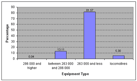 The daily traffic over the Fraser Subdivision consisted of six freight trains and one passenger train. The total tonnage carried in 2002 was approximately 17 million gross tons. The distribution of gross weight per vehicle, in pounds, is given in Figure 2.