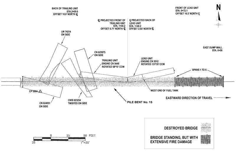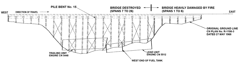 The west end of the bridge (spans 7 to 26) was destroyed during the derailment and the fire that followed. Approximately 65 feet of the east end of the bridge (spans 1 to 6) remained standing, but were damaged by the fire (see Figures 3 and 4).