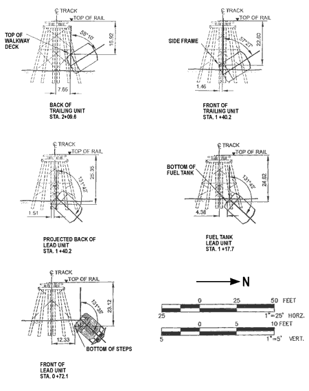 The two locomotives came to rest between bents 7 and 20 near the centre line of the bridge. They were coupled rear to rear. Measurements of their final resting positions were taken relative to the centre line of the bridge and are shown on the diagram (see Figure 5). The front end of the lead locomotive was 72 feet from the east dump wall and the end of the trailing locomotive was 210 feet from the east dump wall. The lead locomotive had rotated through 131 degrees from the upright position, coming to rest on the bank of the gully. The trailing locomotive rotated through 58 degrees.