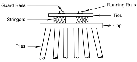The spans were constructed with eight stringers per span, which were bundled in two chords of four stringers each, centred under each rail. The stringer cross-section measured 8 inches by 16 inches.