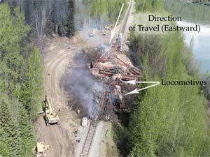 Road access to the bridge was not available; however, they were able to get within approximately 1 km. Considering the possibility of exposure to toxic vapours from dangerous goods and the obvious severity of the situation, the conductor instructed the track maintenance employee to return and notify emergency services. The conductor continued westward to the east end of the bridge. He observed that the locomotives and a number of the cars were in the gully and on fire. He was unable to locate the crew members. The heat from the fire was so intense that access to the locomotives was impossible. The RTC was advised that two locomotives and several cars of lumber had derailed at the bridge at Mile 7.9 and were engulfed in flames at the bottom of the gully.