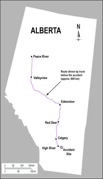 Farmers and their employees were using three cattle-liner trucksFootnote 3 to move their cattle from a summer range near Peace River to a winter range near Enchant (see Figure 1). On October 22, three drivers with three helpers drove 14 hours from Enchant to Peace River where they spent the night. The next day, they worked from 0800 rounding up, separating, and loading cattle into each trailer. They left Peace River at about 1500, refuelled at Valleyview, and stopped for dinner at Red Deer. At approximately 0138, October 24, they were eastbound on Highway 23 when they encountered thick fog. The three drivers set their headlights on low beam to optimize forward visibility.