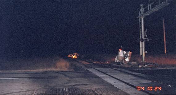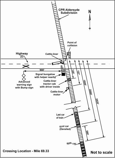 On 24 October 2004 at 0138 mountain daylight time, in thick fog, Canadian Pacific Railway freight train 2nd 269-23, travelling southward towards Lethbridge, Alberta, was struck by an eastbound, loaded cattle-liner truck at the Highway 23 crossing at Mile 69.33 of the Aldersyde Subdivision. Although the collision damaged and derailed a tank car carrying anhydrous ammonia and damaged five other tank cars carrying dangerous goods, there was no loss of product. The collision also caused train separation, the destruction of the tractor portion of the truck, an ensuing fire, serious injury to the driver, and fatal injury to the driver's helper. About 2060 feet (655 m) of track was damaged.